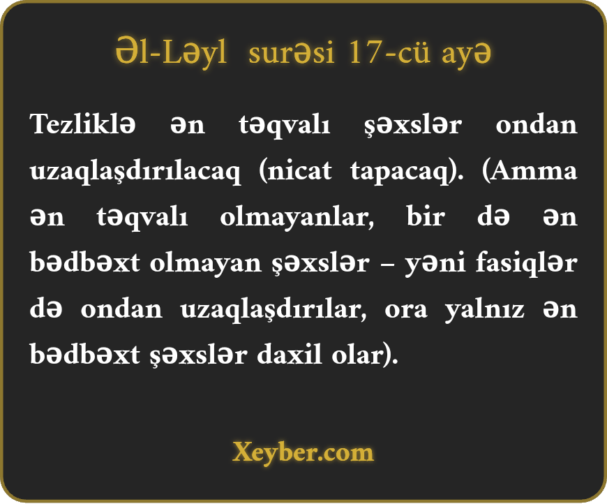 Tezliklə ən təqvalı şəxslər ondan uzaqlaşdırılacaq (nicat tapacaq). (Amma ən təqvalı olmayanlar, bir də ən bədbəxt olmayan şəxslər – yəni fasiqlər də ondan uzaqlaşdırılar, ora yalnız ən bədbəxt şəxslər daxil olar).