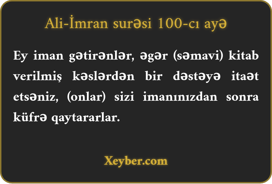 "Ey iman gətirənlər! Əgər kitab əhlindən bir dəstəsinə itaət etsəniz, sizi iman gətirdikdən sonra küfrə döndərərlər.”