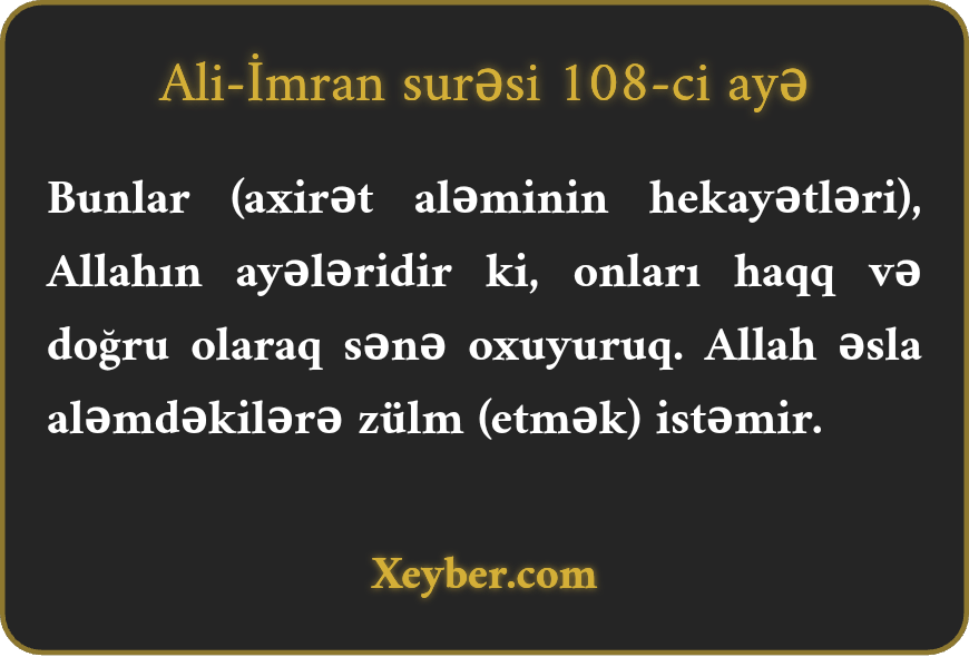 "Sənə haqq olaraq oxuduqlarımız Allahın ayələridir. Allah aləmlərə heç bir sitəm istəməz.”