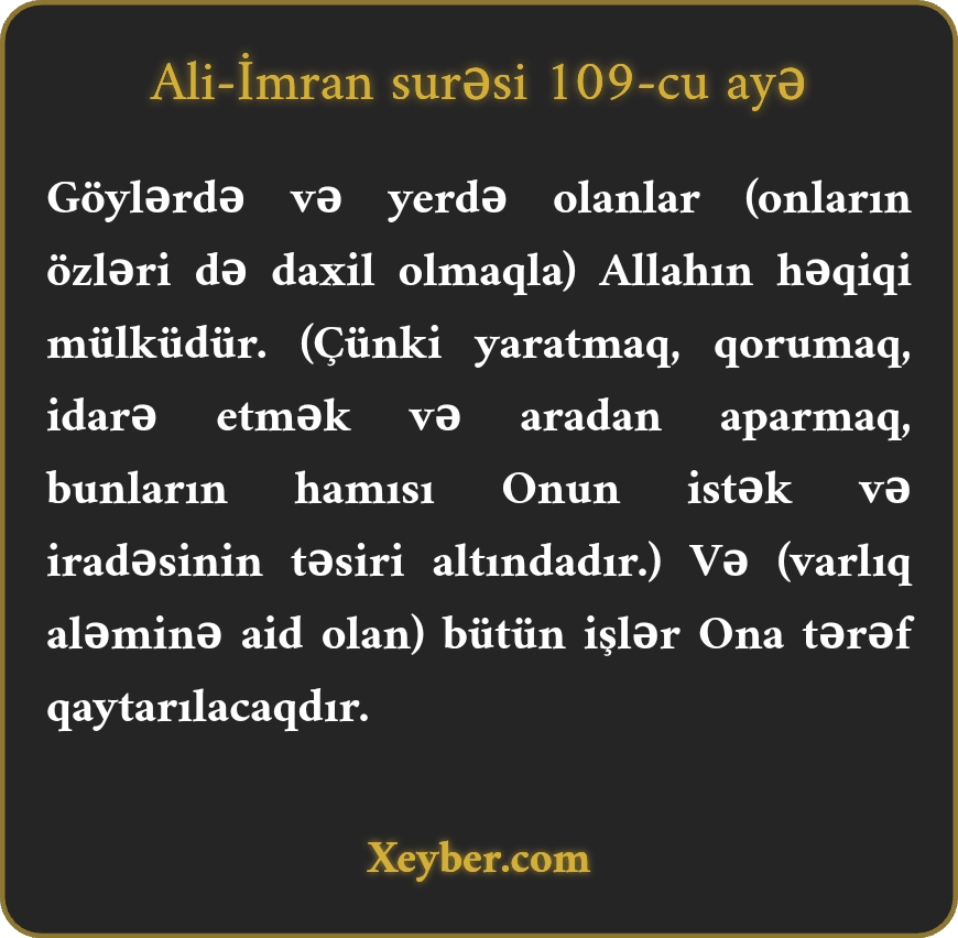 "Göylərdə və yerdə olanlar Allaha məxsusdur. Bütün işlərin qayıdışı yalnız Allaha doğrudur.”