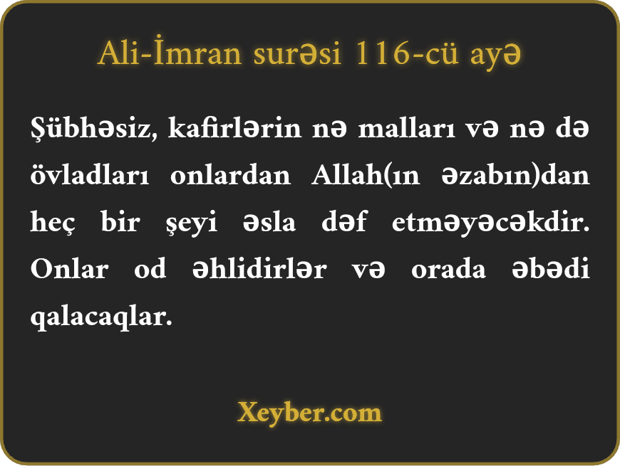 "Həqiqətən, kafir olanların malları və övladları heç vaxt onlardan Allahın əzabını dəf etməz. Onlar oda yoldaşdırlar və daim orada qalarlar.”