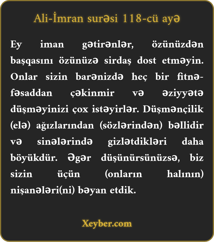 "Ey iman gətirənlər! Özünüzdən qeyrisini sirdaş seçməyin. Onlar sizə çətinlik yaratmaqda boş dayanmazlar. Onlar sizin əziyyətə düşməyinizi istəyirlər. Həqiqətən, onların kin və düşmənçiliyi ağızlarından (danışıqlarından) bilinir. Qəlblərində saxladıqları isə daha böyükdür. Həqiqətən, Biz ayələri sizin üçün bəyan etdik. Əgər düşünsəniz!”