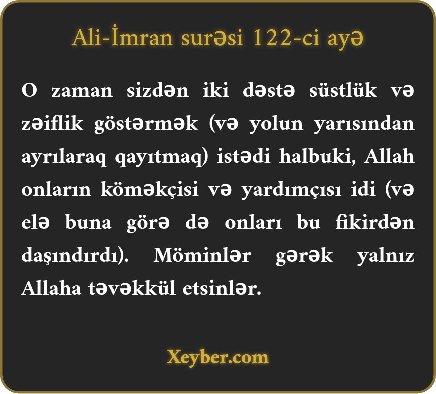"Sizdən olan iki dəstə (döyüşdə) süstlük göstərmək fikrində idi. Amma Allah onların himayəçisi idi. (Bu fikirdən daşınmaqda onlara kömək etdi.) Möminlər yalnız Allaha təvəkkül etsinlər.”