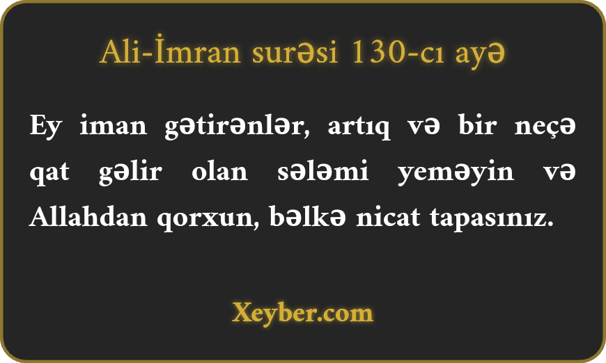 "Ey iman gətirənlər! Ardıcıl artırmaqla sələm yeməyin. Allahdan çəkinin, bəlkə nicat tapasınız.”