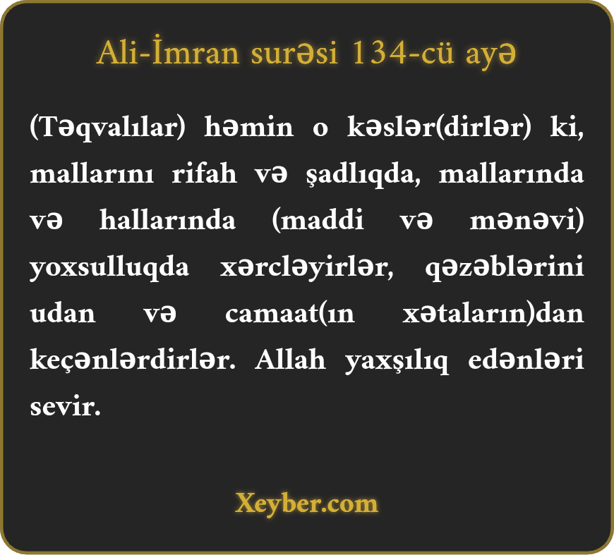 "(Müttəqilər) o kəslərdir ki, həm rahatlıq, həm də çətinlik zamanı infaq edər, öz qəzəblərini udar, xalqın xatalarını bağışlayarlar. Allah yaxşı əməl sahiblərini sevər.”