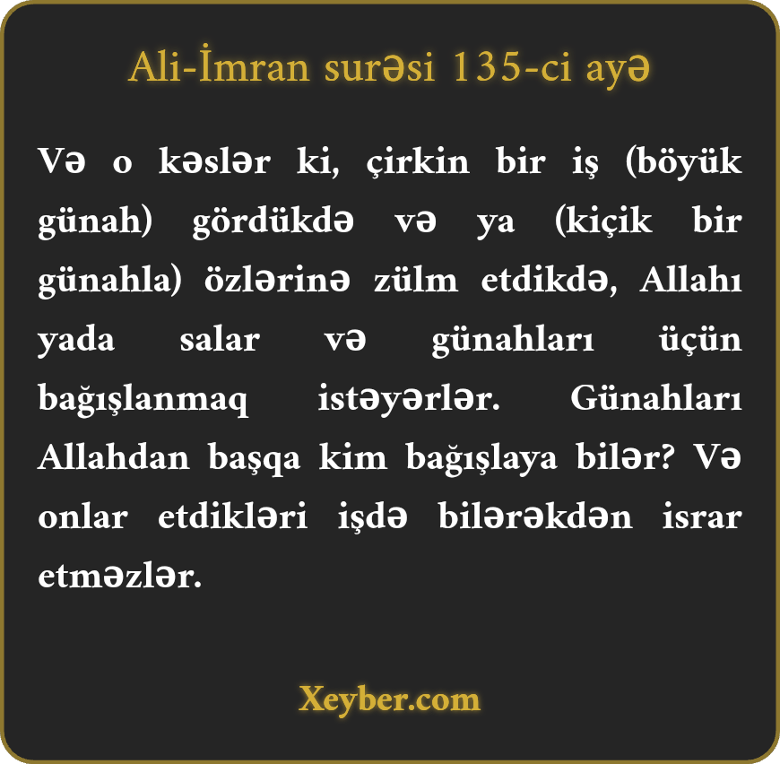 "(Təqvalılar) o kəslərdir ki, pis iş gördükdə və ya özlərinə zülm etdikdə Allahı xatırlayıb, günahlarına görə tövbə edərlər. Allahdan başqa günahları bağışlayan kimdir? (Müttəqilər) günahın pisliyini bildiklərindən gördükləri işi təkrarlamazlar.