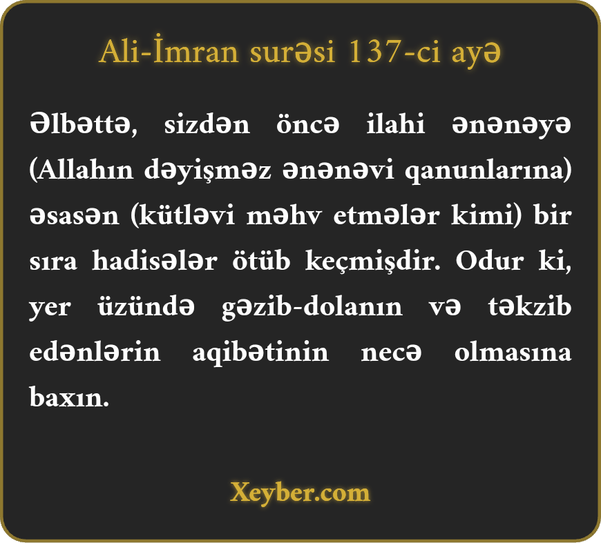 "Sizdən əvvəl də sünnələr, qaydalar olmuşdur. Yer üzündə gəzin və görün ki, təkzib edənlərin aqibəti necə olmuşdur?”