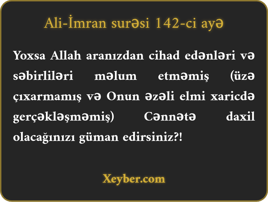 "Yoxsa güman edirsiniz ki, Allah aranızdakı mücahidləri və səbir edənləri müəyyənləşdirməmiş ("imanlıyam” deməklə) behiştə daxil olacaqsınız?!”