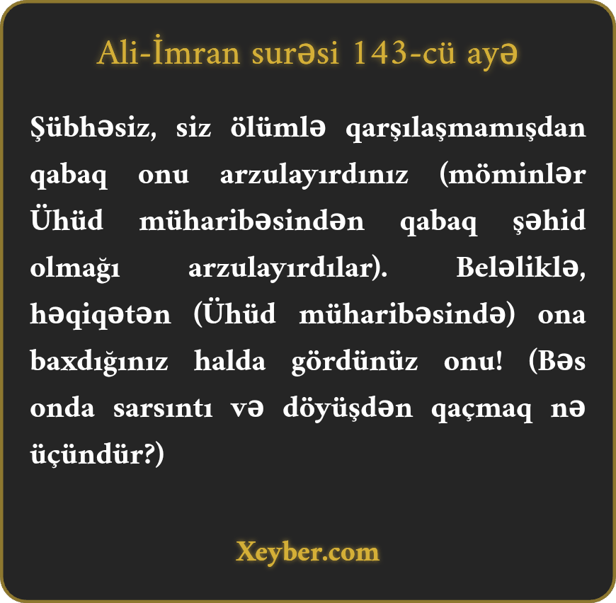"Həqiqətən, siz ölümü (və şəhadəti) onunla üzləşməzdən qabaq (Bədr döyüşündən sonra) çox arzulayırdınız. Sonra onu (Ühüd döyüşündə) gördünüz, amma (narazılıqla) baxdınız.”