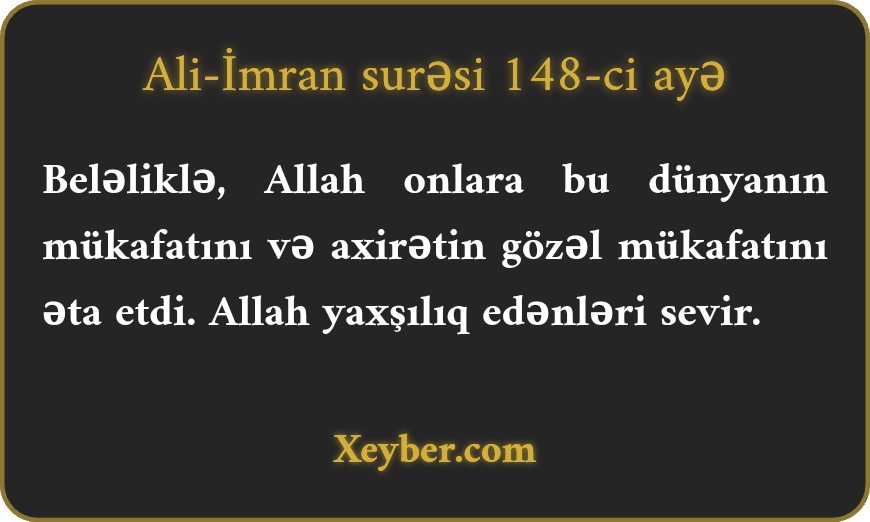 "Allah onlara dünya mükafatı və üstün axirət mükafatı əta etdi. Allah xeyir əməl sahiblərini sevir.”