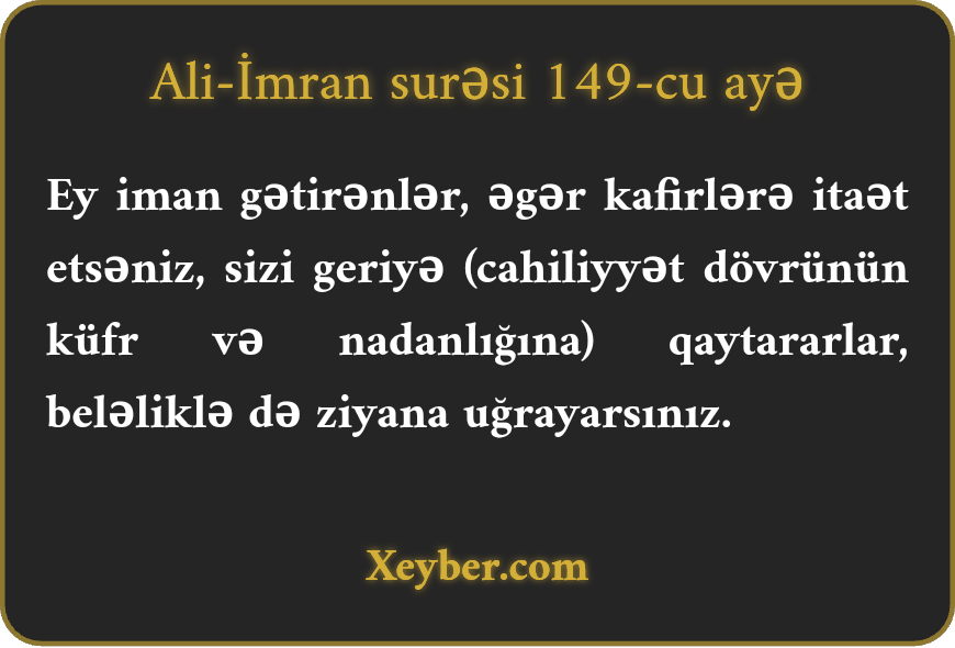 "Ey iman gətirənlər! Əgər kafirlərə itaət etsəniz, onlar sizi keçmişdəkilərinizin kafir ayinlərinə qaytararlar. Siz də yenidən ziyankarlığa qayıdarsınız.”