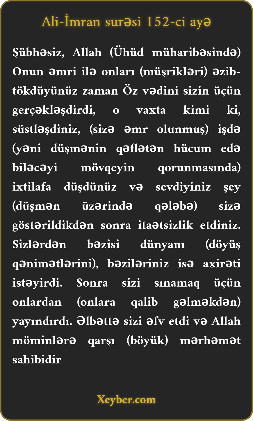 "Allah Öz vədini hökmən gerçəkləşdirər. Çünki düşməni Onun istəyi ilə öldürürdünüz. Allah sevdiyiniz şeyi sizə göstərdiyi halda süstləşdiniz. (Qənimətləri bölməkdə) çəkişməyə başladınız və itaətsizlik etdiniz. Sizin bəziləriniz dünya istəyindədir. Bəziləriniz isə axirəti istəyirsiniz. Həmin vaxt Allah sizi sınamaq üçün geri döndərdi və sizi bağışladı. Həqiqətən, Allah möminlərə münasibətdə fəzl və bəxşiş sahibidir.”