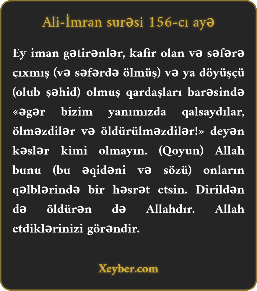 "Ey iman gətirənlər! O kəslərdən olmayın ki, küfr etdilər və səfərə, ya döyüşə gedən qardaşları haqqında belə dedilər: "Əgər yanımızda qalsaydılar, nə ölərdilər, nə də öldürülərdilər.” (Cəbhəyə həvəslə gedin ki,) Allah onu (sizin şücaətinizi) kafirlərin qəlbində bir həsrətə çevirsin. Allah dirildir və öldürür. Allah etdiyiniz işləri görəndir.”