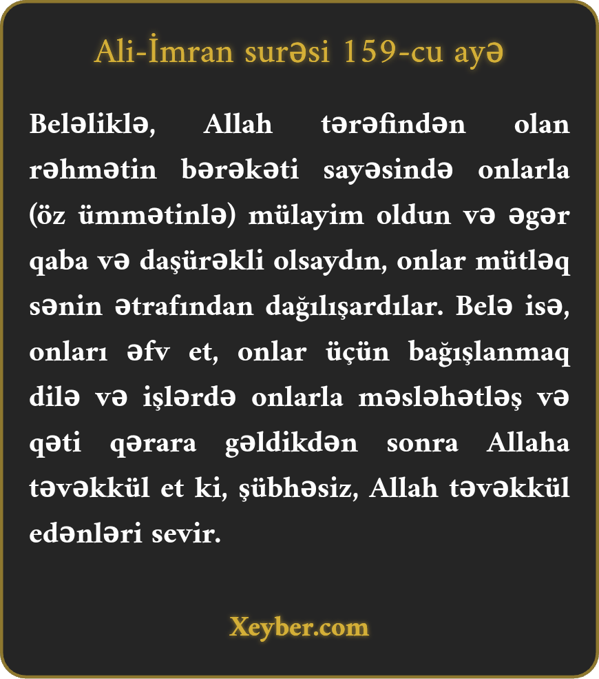 "(Ey peyğəmbər:) Allah tərəfindən olan rəhmətə xatir xalqla mehriban keçinirsən. Əgər sərt və daşürəkli olsaydın, (xalq) sənin ətrafından dağılardı. Beləsə, onların təqsirini bağışla, onlar üçün bağışlanma dilə, işlərdə onlarla məsləhətləş. Qərara gəldiyin zaman Allaha təvəkkül et. Həqiqətən, Allah təvəkkül edənləri sevir.”