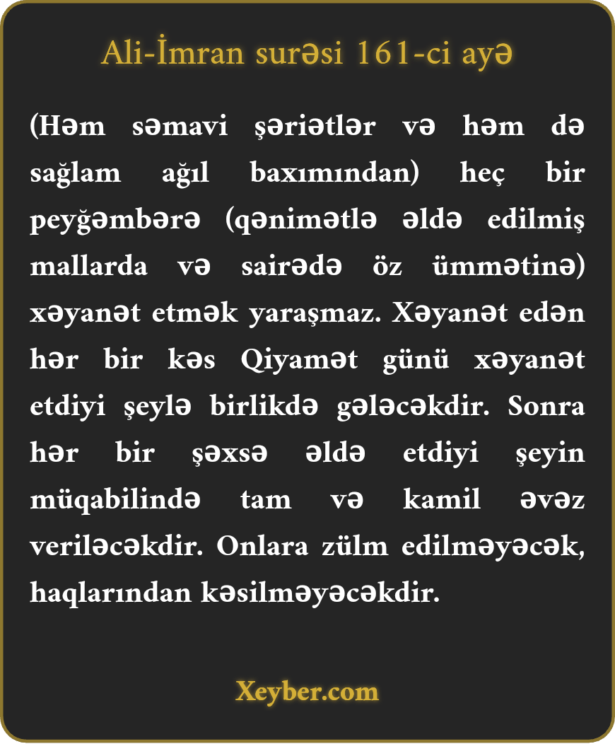 "Heç bir peyğəmbərə yaraşmaz ki, xəyanət etsin. Hər kəs xəyanət etsə, xəyanət etdiyi şey qiyamət günü onunla gələr. Sonra hər kəsə qazandığının kamil qarşılığı verilər və onlar sitəm görməzlər.”
