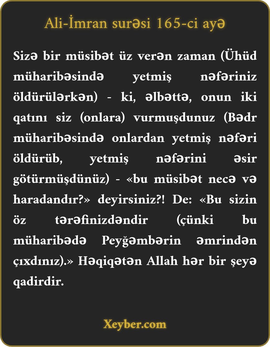"Sizə bir müsibət üz verdikdə ki, düşmən onun iki qat artığına düçar oldu, (yenədəmi) dediniz ki, bu müsibət haradandır? De ki, bu, özünüzdəndir. Şübhəsiz, Allah hər bir işə qadirdir.”