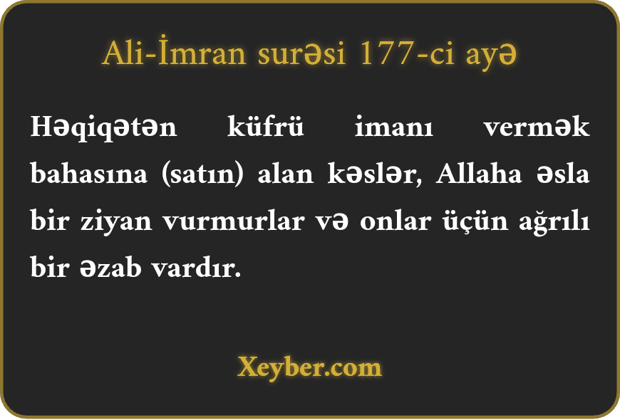 "Şübhəsiz, imanı küfrlə dəyişənlər heç vaxt Allaha zərər vurmazlar. Onlar üçün dərdli bir əzab var.”