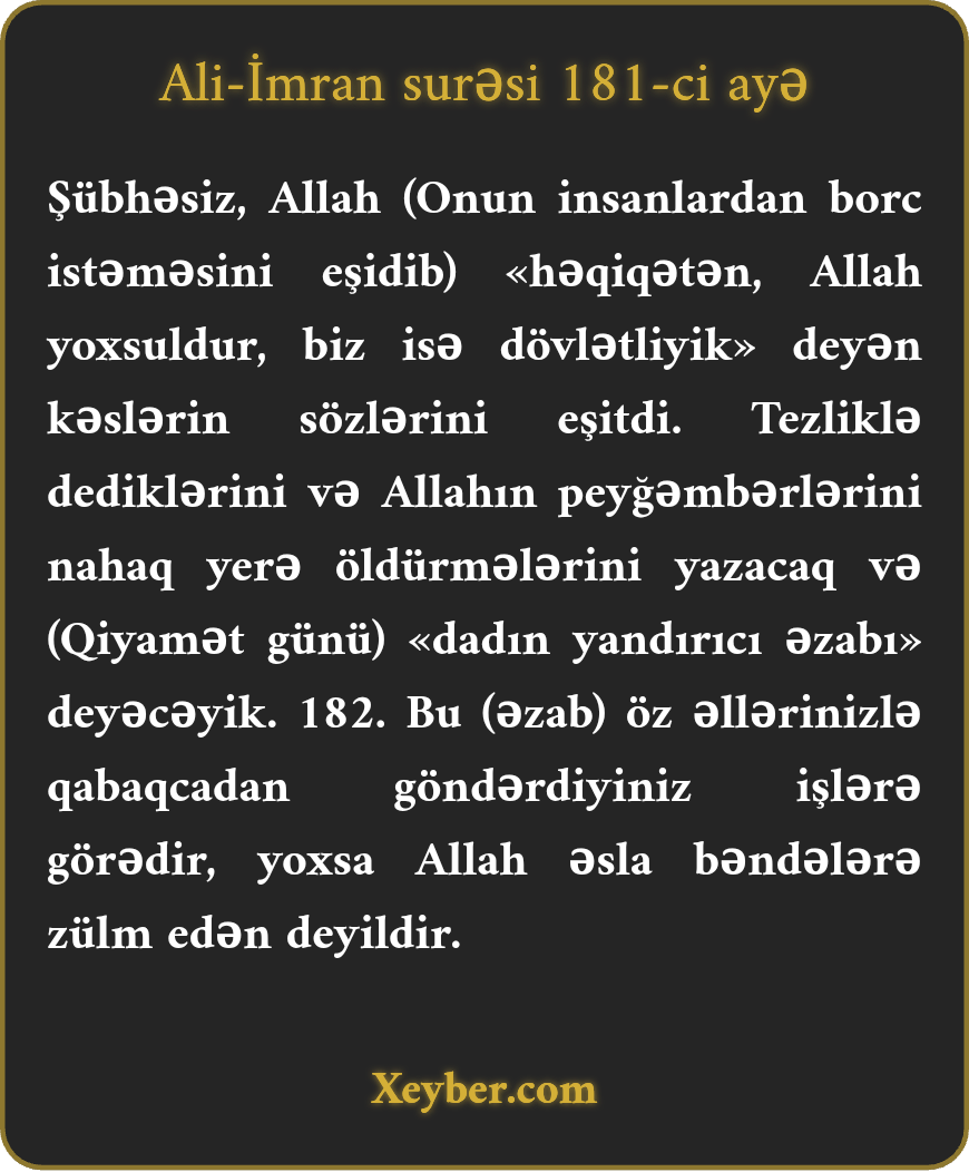 "Həqiqətən, Allah "Allah fəqirdir, biz isə imkanlı” deyənlərin sözünü eşitdi. Tezliklə onların bu sözünü, peyğəmbərləri nahaqdan öldürmələrini yazacağıq və onlara deyəcəyik: Dadın yandırıcı atəşin əzabını.”