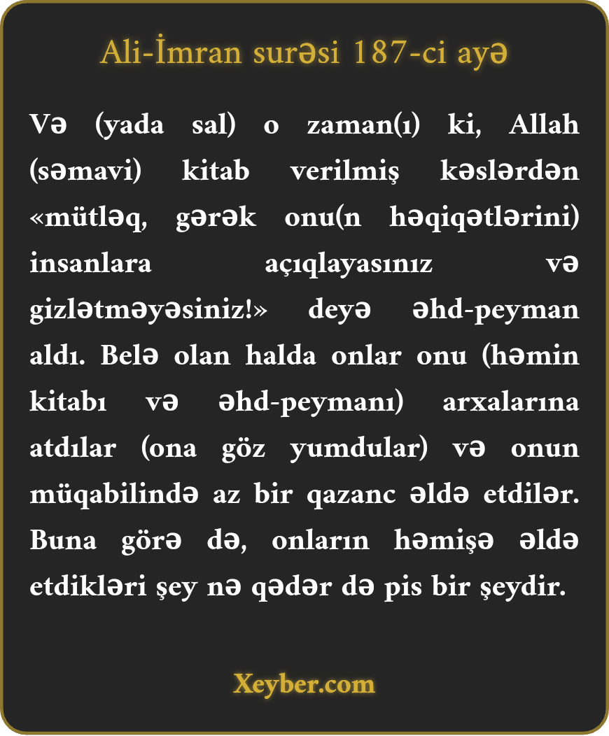 "(Xatırla,) o zaman ki, Allah kitab verdiyi kəslərdən onu hökmən xalqa bəyan etmələri və gizlətməmələri barədə əhd aldı. Onlar bu əhdə arxa çevirib, onu ucuz qiymətə dəyişdilər. Necə də pis müamilə etdilər!”