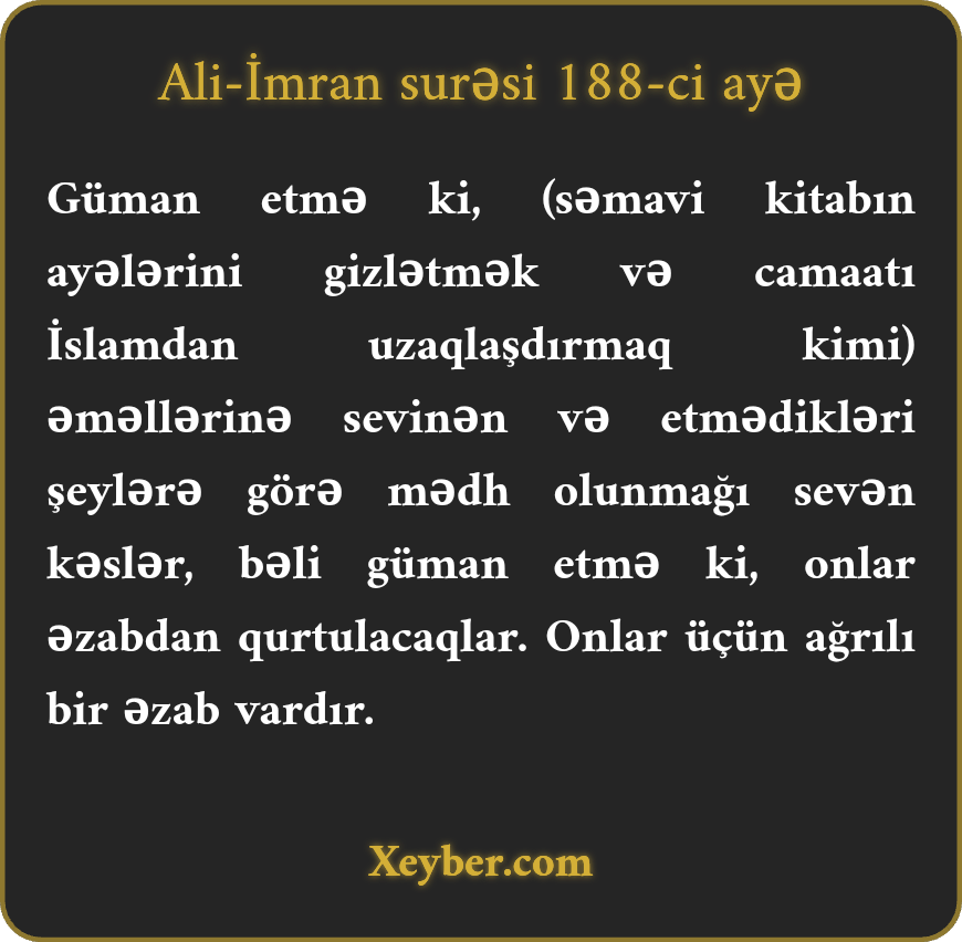 "Güman etmə ki, etdikləri işlərdən şad olanlar, etmədiyi işlərə görə təriflənmək istəyənlər ilahi əzabdan qurtulmuşlar. Onlar üçün dərdli əzab var.”