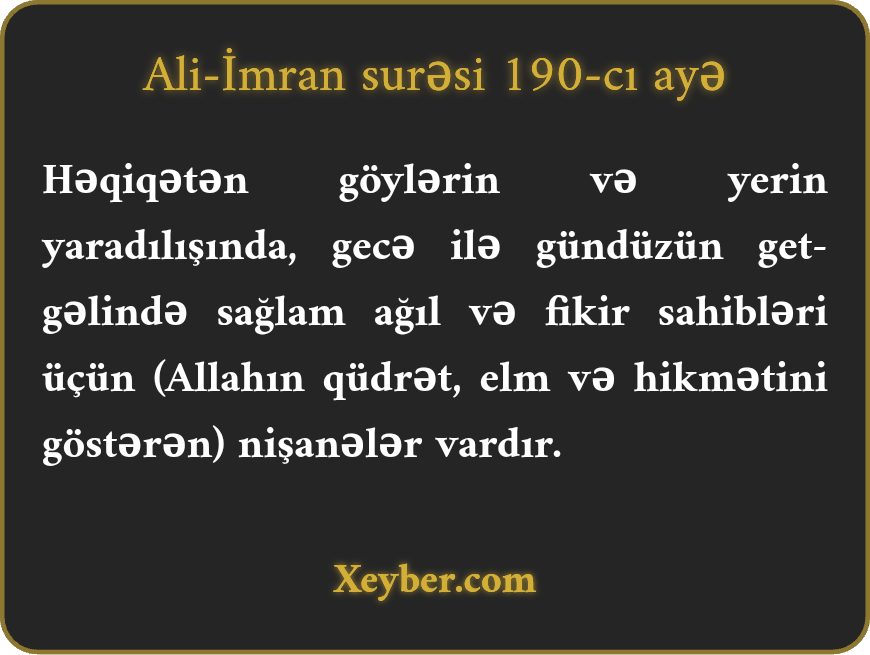 "Həqiqətən, göylərin və yerin yaranışında, gecə və gündüzün bir-birinin ardınca gəlməsində düşüncə sahibləri üçün (Allahın elm, rəhmət, qüdrət, malikiyyət, hakimiyyət və tədbirinə) nişanələr var.”