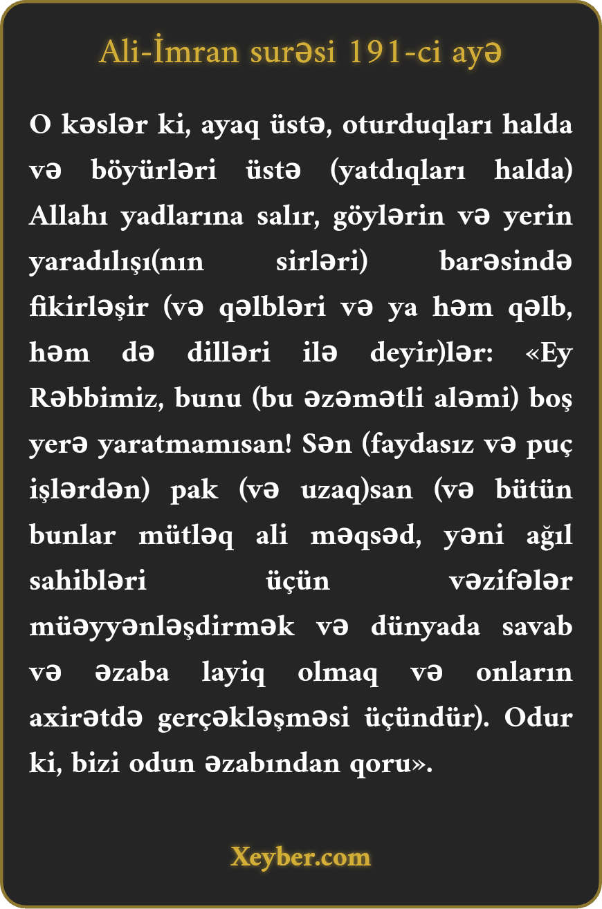 "(Düşüncə sahibləri) o kəslərdir ki, ayaq üstə, oturaq və uzanmış halda Allahı yad edər, göylərin və yerin yaranışı haqqında düşünərlər. (Can-dildən deyərlər:) «Pərvərdigara! Bu varlıq aləmini boş yerə yaratmamısan, Sən pak-pakizəsən. Bizi atəş əzabından qoru.»”