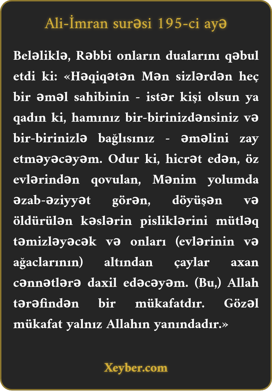 "Rəbləri onların duasını qəbul edib buyurdu ki, mən sizlərdən - istər kişi, istər qadın, hamısı bir-birindəndir - kimsənin əməlini puç etmərəm (mükafatsız qoymaram.) Hicrət edib evlərindən qovulanların, mənim yolumda əzab-əziyyət görənlərin, döyüşüb öldürülənlərin büdrəmələrini, şübhəsiz ki, pərdələyərəm. Onları altından çaylar axan cənnətlərə daxil edərəm. Bu, Allah tərəfindən bir mükafatdır. Yaxşı mükafat yalnız Allahın yanındadır.”