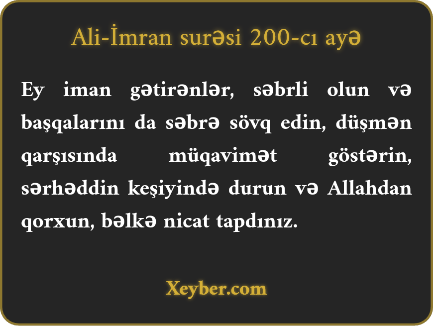 "Ey iman gətirənlər! (Çətinliklər və nəfs istəkləri qarşısında) səbirli olun, (düşmənlər qarşısında) möhkəm dayanın (başqalarını da səbrə dəvət edin), sərhədləri qoruyun və Allahdan çəkinin. Bəlkə nicat tapasınız.”