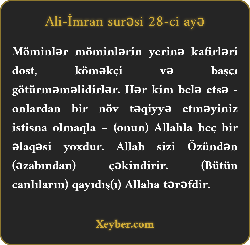 "İman əhli möminləri qoyub, kafirləri dost tutmamalı və onları rəhbər seçməməlidirlər. Belə edənlərin Allah yanında heç bir dəyərləri yoxdur. Kafirlərdən qorxub təqiyyə edən istisnadır. (Daha mühüm məqsədlər naminə müvəqqəti olaraq onlarla keçinin.) Allah sizə xəbərdarlıq edir. Qayıdış Allaha doğrudur.”