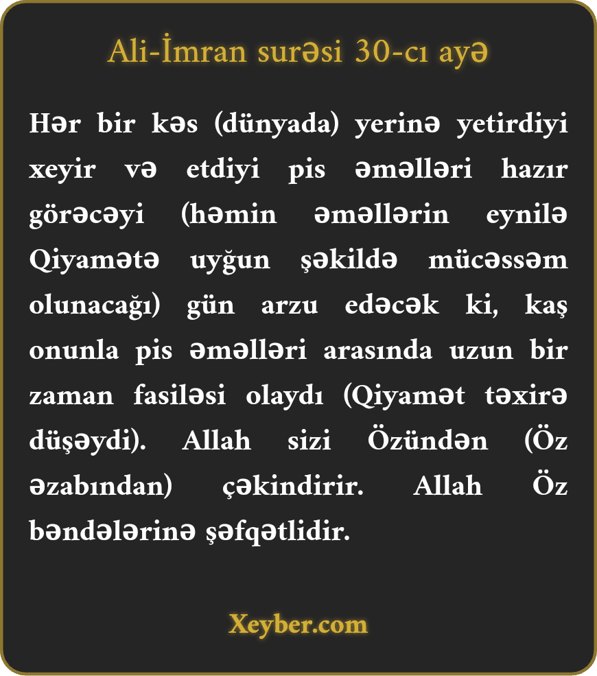 "Elə bir gün ki, hər kəs etdiyi yaxşı işləri hazır görəcək və etdiyi pis işlərlə öz arasında uzaq məsafə olmasını arzulayacaq. Allah sizi (əmri ilə müxalifətçilikdən) çəkindirir. Allah bəndələrlə mehribandır.”