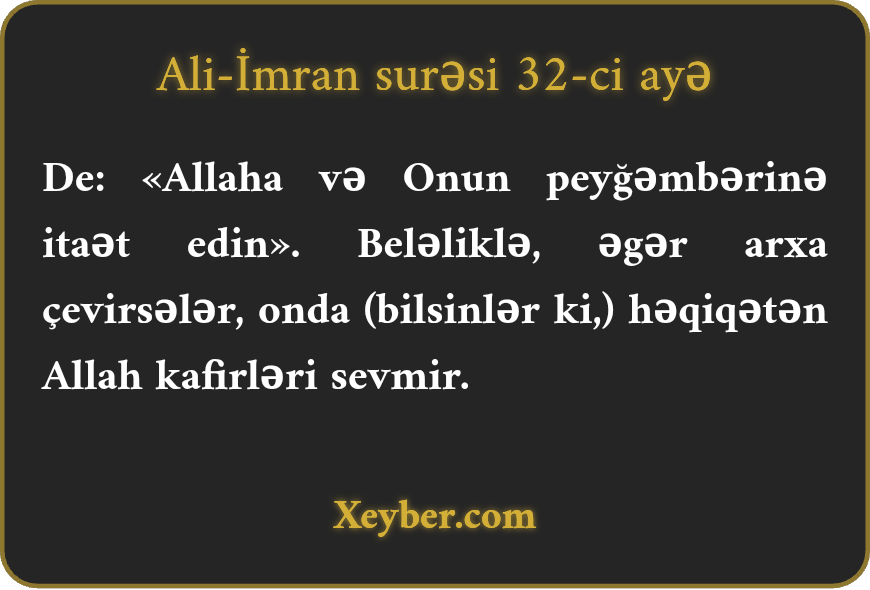 "De ki, Allaha və Onun rəsuluna itaət edin. Əgər boyun qaçırsanız, bilin ki, həqiqətən, Allah kafirləri sevmir.”