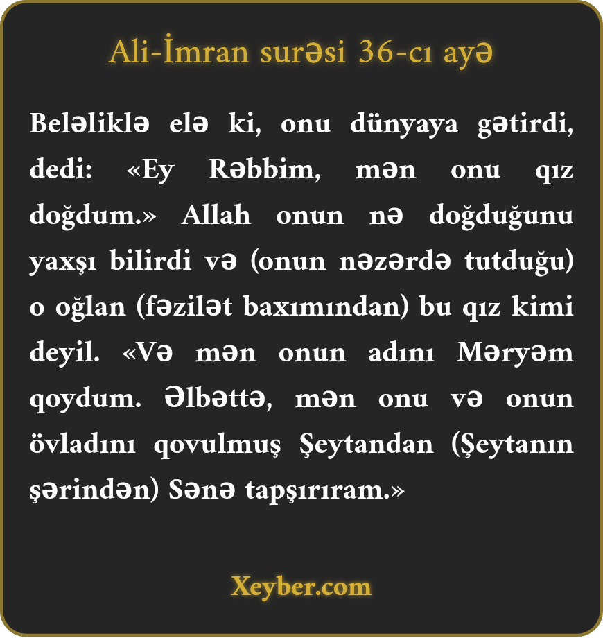 "Dünyaya övlad gətirdiyi vaxt dedi: "Pərvərdigara! Mən qız doğdum. Halbuki Allah onun dünyaya gətirəcəyini daha yaxşı bilir. Oğlan qız kimi deyil. Mən onun adını Məryəm qoydum. Onu və onun övladını qovulmuş şeytanın şərindən Sənin pənahına verirəm.”