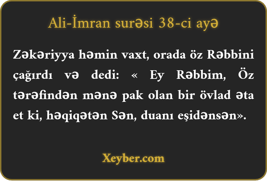 "Bu məqamda (bütün bu kəramətləri və səma süfrəsini gördükdə) Zəkəriyya öz Rəbbini çağırdı və dedi: «Pərvərdigara! Öz tərəfindən mənə pak və bəyənilmiş bir nəsil əta et. Həqiqətən, Sən duaları eşidənsən.»”