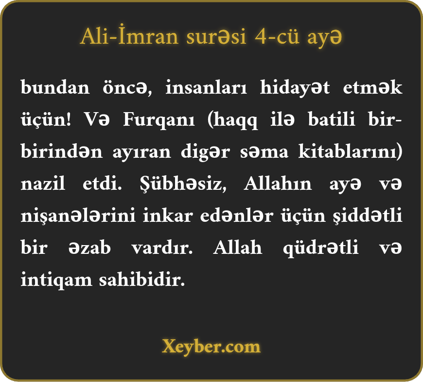 "Bundan qabaq (Tövrat və İncili) xalqın hidayəti üçün (O göndərdi). İndi isə (haqqı batildən seçmə vasitəsi olan) fürqanı nazil etdi. Əlbəttə, ilahi ayələrə küfr edənlər üçün şiddətli əzab var. Allah yenilməz və intiqam sahibidir.”