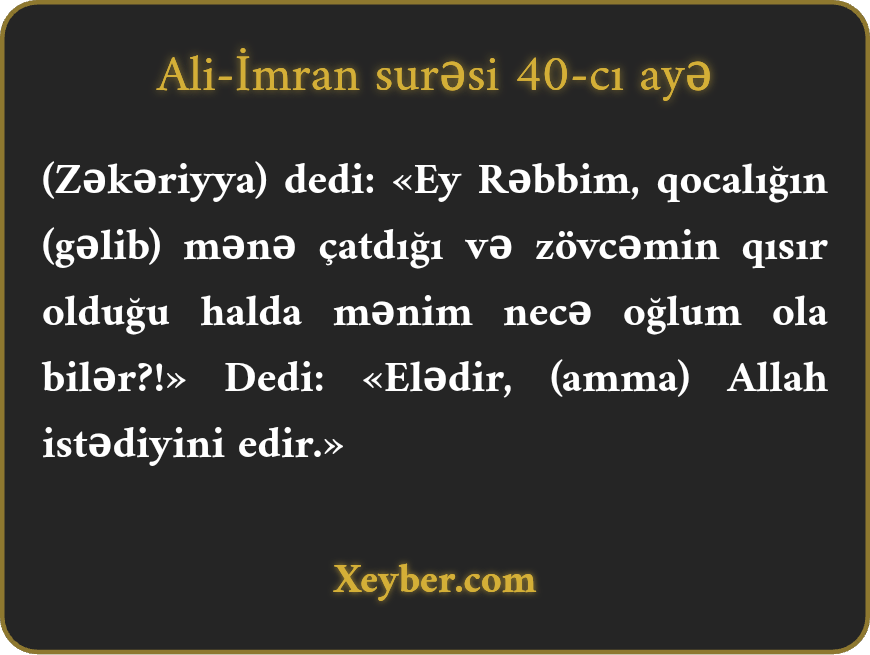 "(Zəkəriyya) dedi: Pərvərdigara! Qocalığa çatdığım, zövcəmin doğma yaşı keçdiyi halda mənim oğlum ola bilərmi?! Buyurdu: "Allah istədiyini bu sayaq yerinə yetirər.”