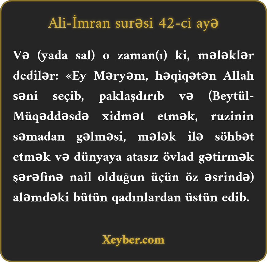 "(Yada sal,) o zaman ki, mələklər dedi: "Ey Məryəm! Həqiqətən, Allah səni seçmiş, paklamış və dünya qadınlarından üstün etmişdir.”