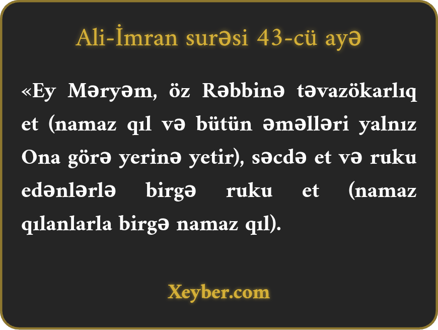 "Ey Məryəm! (Bütün bu nemətlərin şükrü üçün) rəbbinə müti ol, səcdə qıl və rükuya gedənlərlə birlikdə rükuya get.”