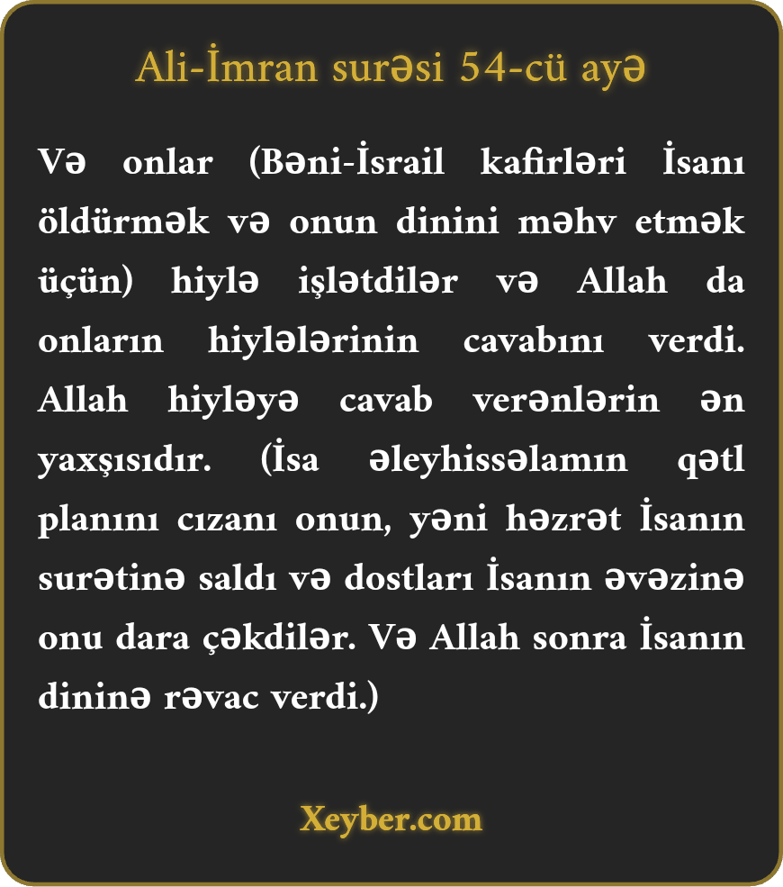 "(İsanın düşmənləri) öz tədbirlərini (onu qətlə yetirmək üçün) işə saldılar. Allah da öz tədbirini işə saldı. Allah ən yaxşı tədbir görəndir.”