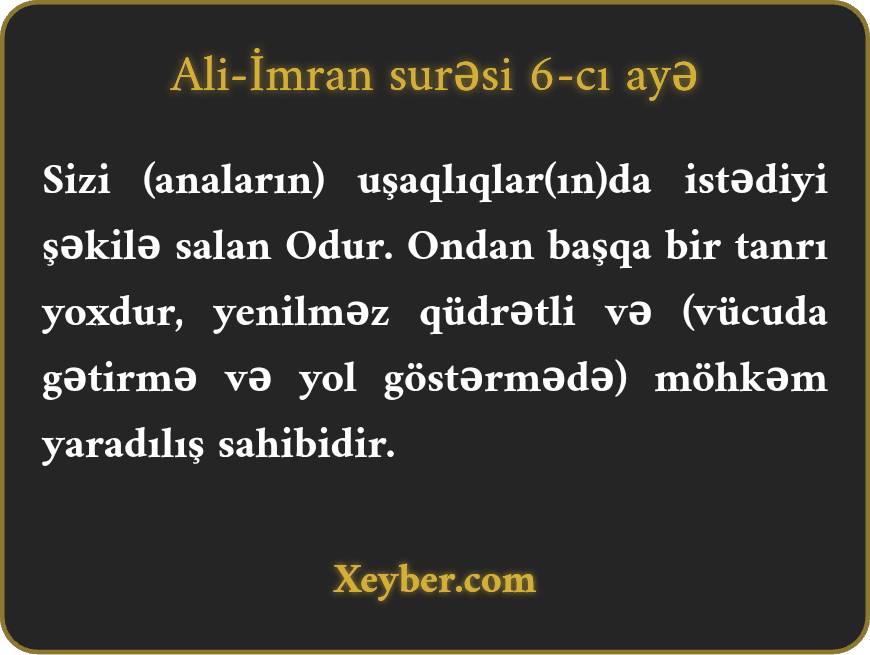 "O, sizi bətinlərdə istədiyi şəklə salan kəsdir. İqtidar və hikmət sahibi olan Allahdan savay məbud yoxdur”.