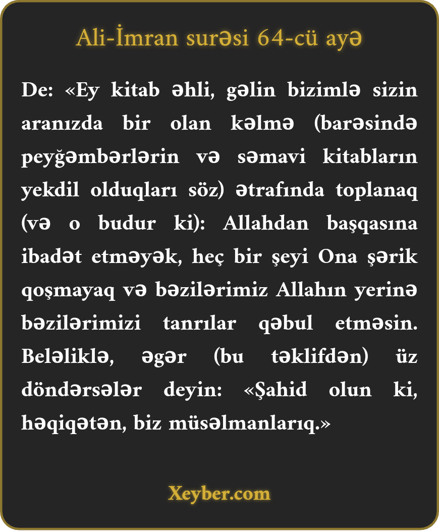 "De ki, ey kitab əhli, aramızdakı müştərək sözə doğru gəlin. Allahdan qeyrisinə pərəstiş etməyək, Ona şərik qərar verməyək, bəzilərimiz bəzilərini Allahın yerinə Rəbb götürməyək. Əgər (bu təklifdən) üz döndərsələr, deyin: Şahid olun ki, biz müsəlmanıq (və Allaha təslimik).”