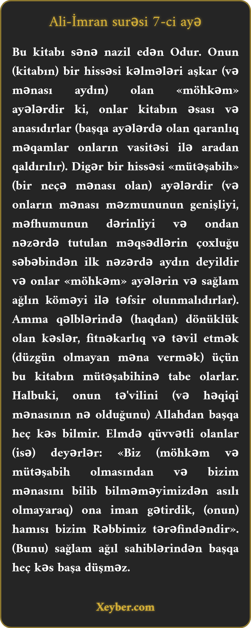 "O, bu kitabı sənə nazil edən kəsdir. Onun (kitabın) bir hissəsi kitabın əsasını təşkil edən möhkəm ayələrdən ibarətdir. (Digər ayələrə münasibətdə yaranmış şübhələr möhkəm ayələrə müraciət etməklə aydınlaşır.) Onun bir hissəsi isə mütəşabehdir. (Bu ayələr ilk baxışdan müxtəlif cür mənalandırıla bilər.) Qəlbində azğınlıq olanlar fitnə yaratmaq (xalqı azdırmaq) üçün, eləcə də, ayələri istədikləri kimi təfsir etmək məqsədi ilə mütəşabeh ayələrə üz tuturlar. Halbuki bu ayələrin təfsirini Allahdan və elmdə qüvvətlilərdən başqaları bilmir. Belələri deyirlər: "Biz ona iman gətirmişik və bütün ayələr Allahımız tərəfindəndir (istər möhkəm olsun, istər mütəşabeh.) Bundan yalnız düşüncə sahibləri öyüd götürər.”