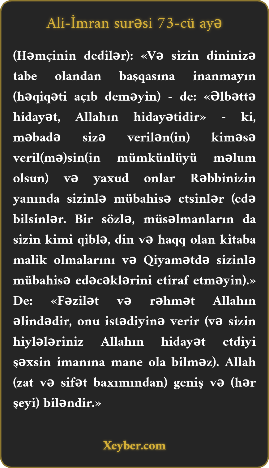 "(Yəhudi böyükləri öz ardıcıllarını İslamın qəbulundan çəkindirmək üçün onlara deyirdilər:) «Sizin ayinlərinizə itaət edənlərdən başqasına iman gətirməyin.» (Ey peyğəmbər, onlara) de ki, səadət yolu Allahın göstərdiyi yoldur. Digər bir ümmətə də sizə verildiyi kimi (kitab və şəriət) verilməsi, Allah hüzurunda onların sizlə mübahisəsi mümkündür. (Ey peyğəmbər, onlara) de ki, fəzl və rəhmət Allahın əlindədir. O, istədiyinə əta edir. Allah geniş rəhmət və sonsuz elm sahibidir.”