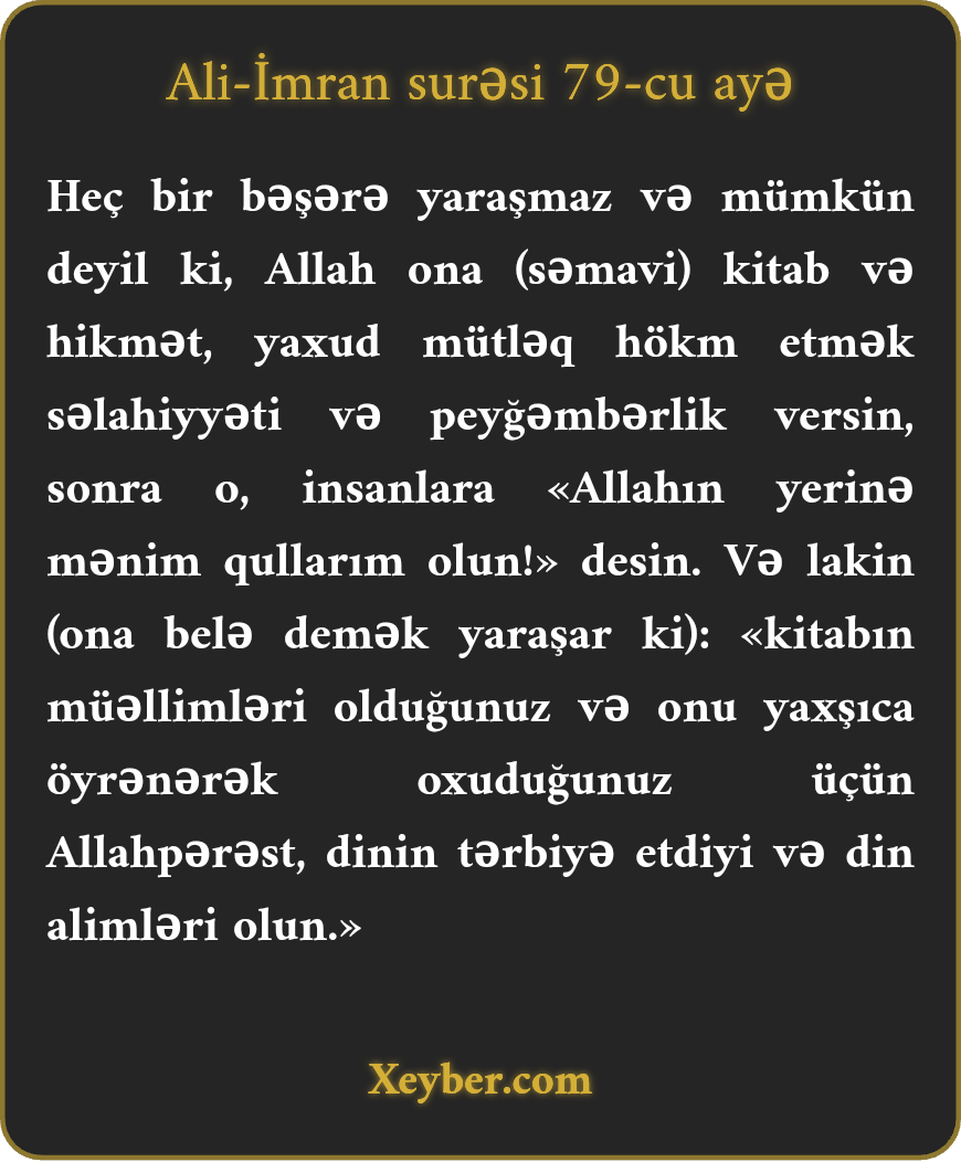 "Allahın Kitab, hökm və nübuvvət verdiyi heç bir bəşər (və peyğəmbər) xalqa deyə bilməz ki, «Allah əvəzində mənə bəndə olun.» Lakin siz keçmişdə kitab təlim-tədris etdiyiniz üçün rəbbani olun.”
