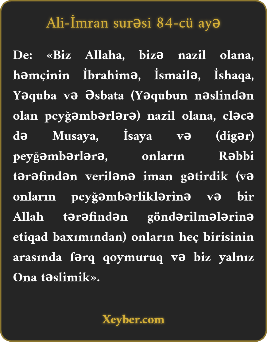 «De, Allaha və bizə nazil olana, İbrahimə, İsmailə, İshaqa, Yəquba və Əsbata (Yəqubun nəslindən olan peyğəmbərlərə) nazil edilənə, Musaya, İsaya və dirgər peyğəmbərlərə Rəbbləri tərəfindən verilənə iman gətirmişik, onlardan heç birinin arasında fərq qoymuruq və biz təkcə Ona (əmrlərinə) təslimik.»