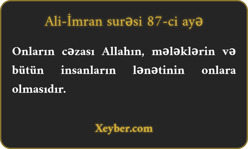 "Onların (aşkar dəlillərdən və iman gətirdikdən sonra mürtəd olanların) cəzası budur ki, Allahın, mələklərin və ümum camaatın lənətinə düçar olsunlar.”