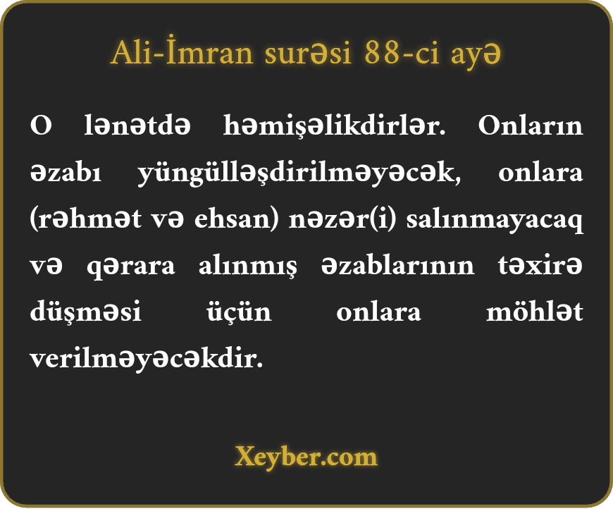"Onlar daim (Allah, mələklər və xalqın) lənətinə düçardırlar. Onların nə əzabı azalar, nə də onlara möhlət verilər.”
