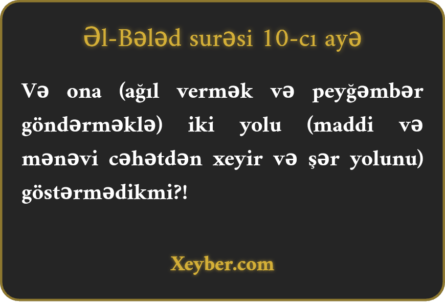 Və ona (ağıl vermək və peyğəmbər göndərməklə) iki yolu (maddi və mənəvi cəhətdən xeyir və şər yolunu) göstərmədikmi?!