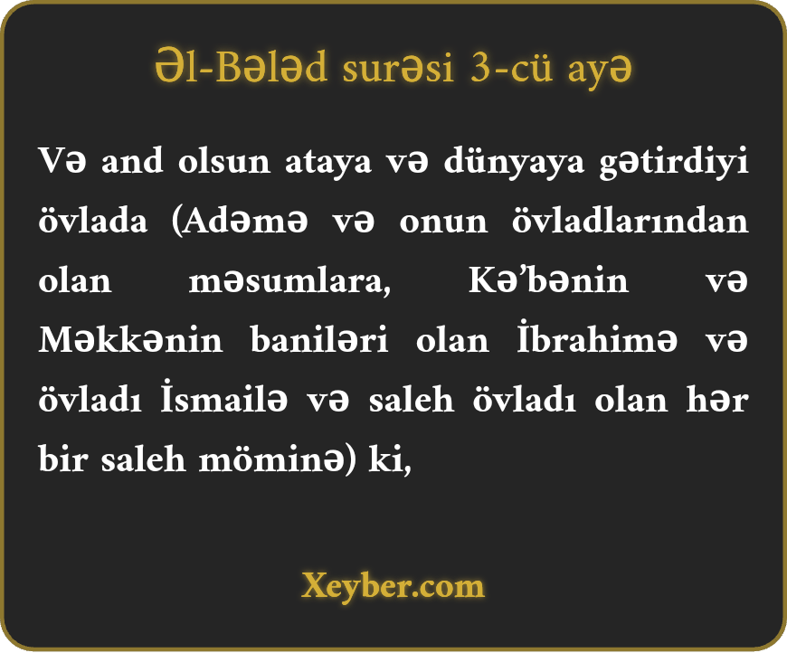 Və and olsun ataya və dünyaya gətirdiyi övlada (Adəmə və onun övladlarından olan məsumlara, Kə’bənin və Məkkənin baniləri olan İbrahimə və övladı İsmailə və saleh övladı olan hər bir saleh möminə) ki,
