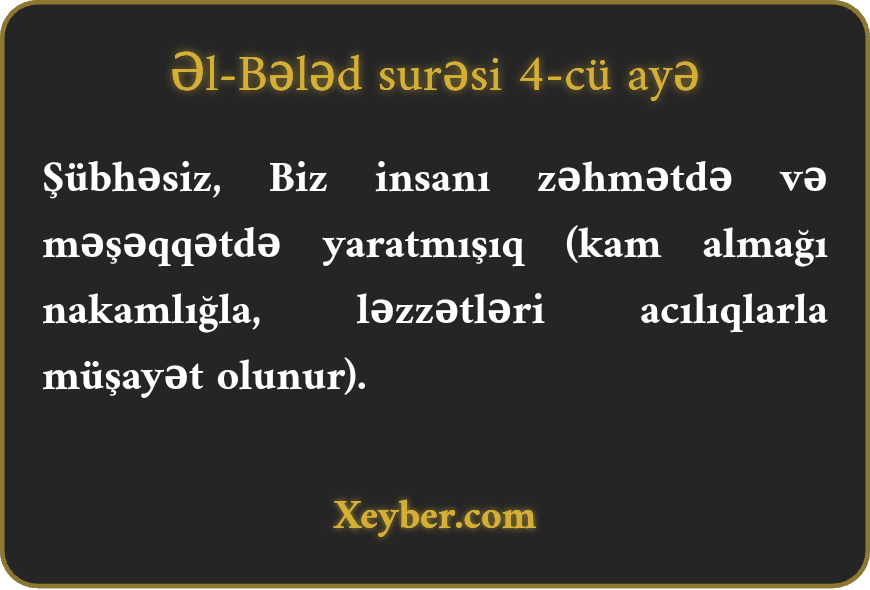 Şübhəsiz, Biz insanı zəhmətdə və məşəqqətdə yaratmışıq (kam almağı nakamlığla, ləzzətləri acılıqlarla müşayət olunur).