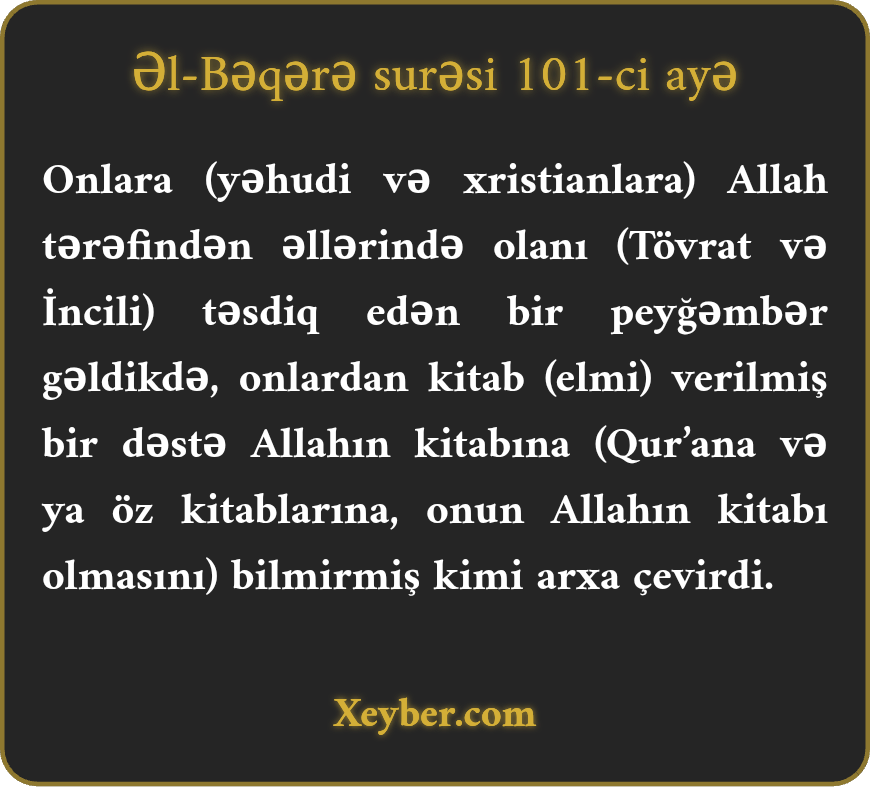 "Elə ki, Allah tərəfindən onlarda olanı (Tövratı) təsdiq edən peyğəmbər soraqlarına gəldi, kitab əhlindən bir qismi Allahın kitabına arxa çevirdi. Sanki bu işdən tamamilə xəbərsiz idilər.”